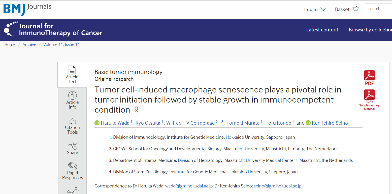 Wada H, Otsuka R, Germeraad WTV, et al. Tumor cell-induced macrophage senescence plays a pivotal role in tumor initiation followed by stable growth in immunocompetent condition.Journal for ImmunoTherapy of Cancer 2023;11:e006677.doi:10.1136/jitc-2023-006677